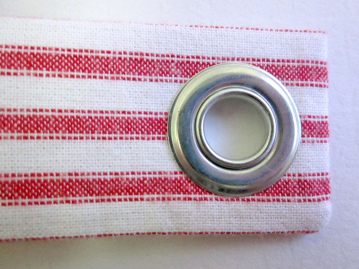 6. Following manufacturer’s instructions, add a grommet to the finished end (not the raw end) of each loop. The placement for the grommet is ¾” from the center of the grommet’s hole to the finished end.