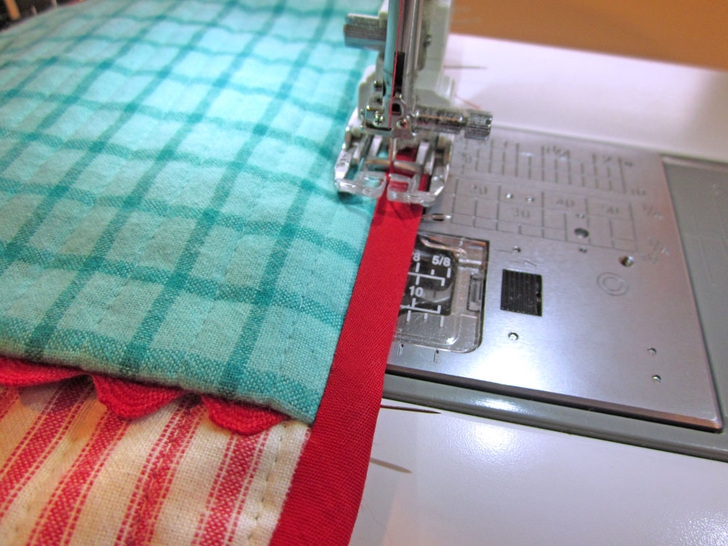 8. From the pocket side of the hot pad, edgestitch the bias tape, making sure to catch the fold on the underside as you sew.