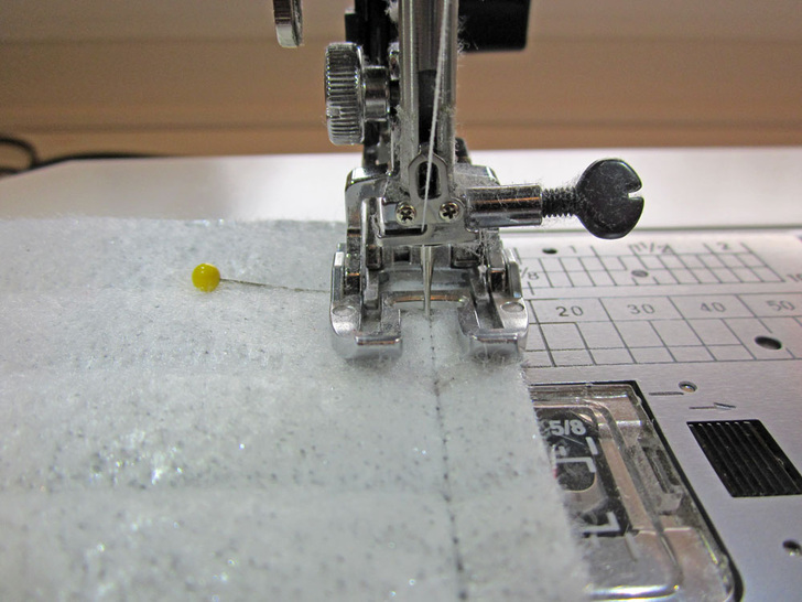 NOTE: We used the awesome Janome AcuFeed Flex™. It is specially designed to work with multiple layers, keeping them all moving together without slipping or sliding. Your machine may have something similar, such as a Walking/Even Feed foot. These are all optional; they simply make the process quicker and more accurate. You can certainly use your regular pressure foot. Just go slowly and carefully, and use a few more pins.