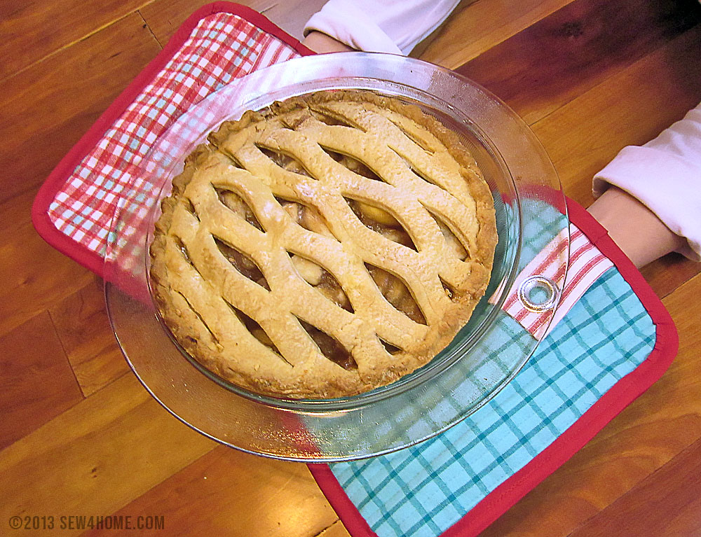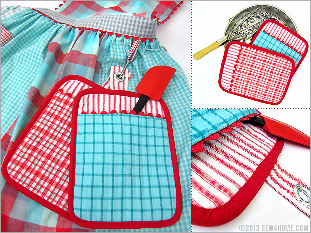 These clever hot pads are the best of both worlds: a 7″ x 9″ insulated rectangle for grab-and-go convenience with a back slip-in pocket for the added agility of an oven mitt. It’s a great vintage-style combo. Plus, you can make our two hot pads from just three fat quarters! Do you love that matching apron in the photo above? It’s also made from completely from fat quarters. Isn’t it fun to mix and match?!