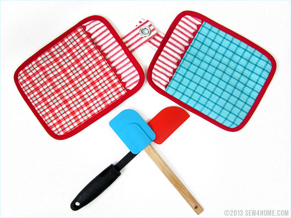 We went minimalist with the photos for this new version of a classic project. It you find yourself getting lost in the instructions, please take a look at the original Oven Mitts tutorial on which this is based.. There are additional photos to help you along, and the assembly between the two projects is virtually identical. The only real difference is our use of packaged binding for today’s version over custom binding in the original. And, we amped up the hanging loop, making it much wider and adding a metal grommet.