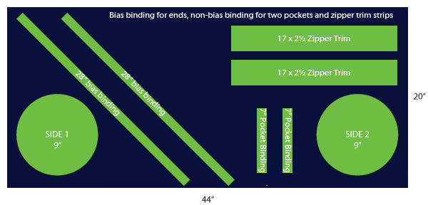 NOTE: As shown below, we recommend cutting the bias strips for the end panel piping as single lengths, which does require a bit more fabric but is a nicer finished look.