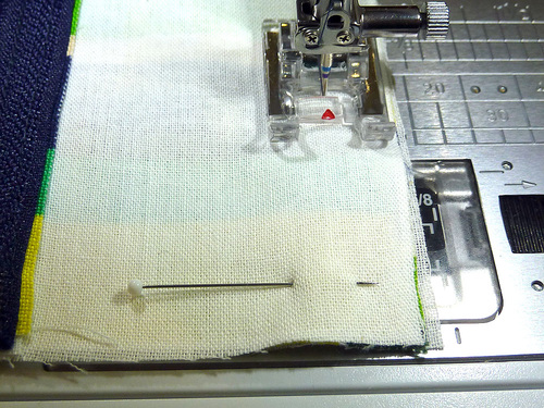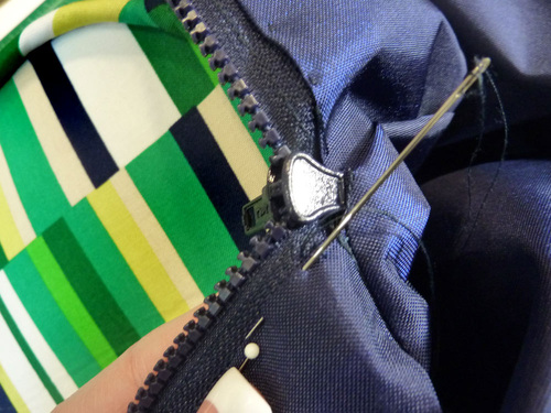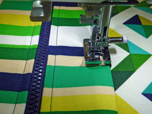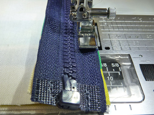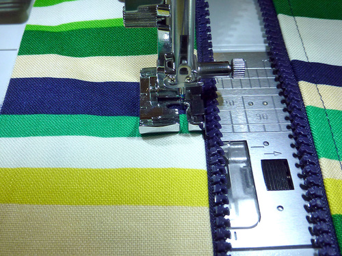 - As with all zipper stitching, it is easiest to start with the zipper about half way open. Stitch until you are just about to the zipper pull. Stop, with the needle in the down position and gently twist the fabric in order to allow you to close the zipper. Reposition and finish the seam.