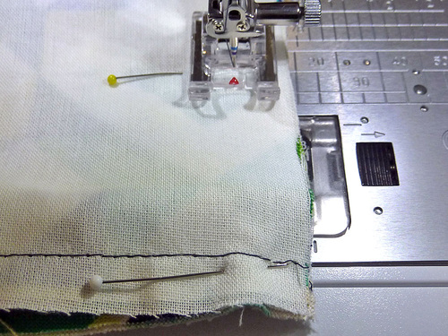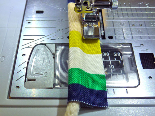 - Re-attach the Zipper foot. Machine baste the raw edges together, running this seam right along the piping.