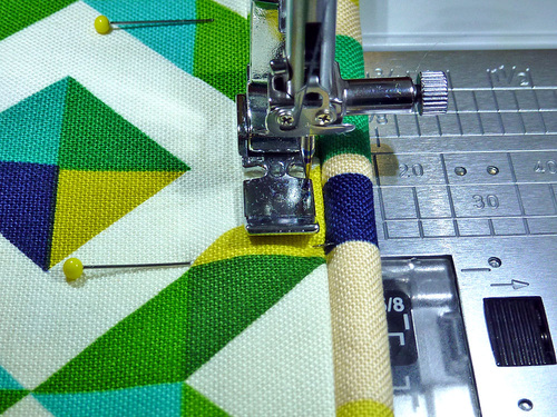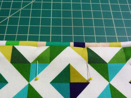 - Bring the opposite 7″ edge up into position. This folded edge should sit right below the piping and should be in alignment with the opposite folded edge, sandwiching the piping. Pin in place through all the layers.