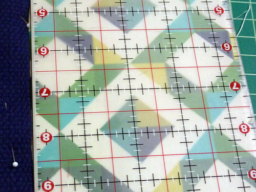 - On each end panel, place a pin at the exact center top, exact center bottom, and the center of each side. Think of it like at clock, with pin points at 12:00, 3:00, 6:00, and 9:00. Because we had a strong horizontal motif to maintain that would have looked very wonky if off, we carefully folded our end panels in half one way then in half the opposite way, clipping the fold points each time as marks. This insured our 12:00, 3:00, 6:00, and 9:00 points were exactly matched to the horizontal lines of the fabric.