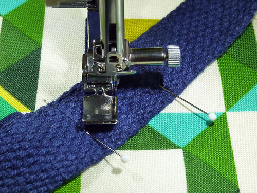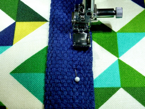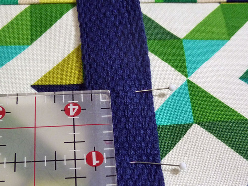 - Pin each side of the webbing in place from the bottom up the side and stopping 1″ above the top of the pocket’s piped edge. As a double-check, this stopping point is 2½” below the zipper accent panel seam.