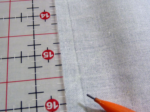 - Find the 4″ strip of mid-weight interfacing. Draw a line down the exact center, 2″ in from each side.