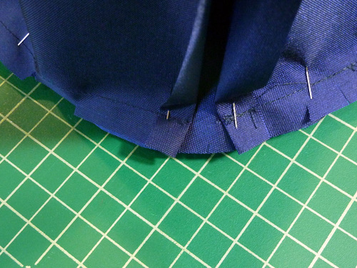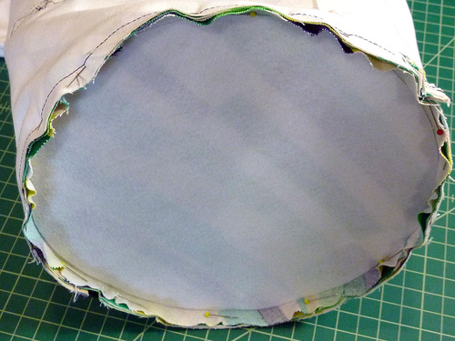 - Place the end panel right sides together with circular opening of the duffle, aligning all the pin points. Easing the fabric, fill in the rest of the circle with pins. If you have done garment sewing, this is very similar to putting in a sleeve.