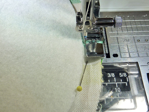 - Re-attach the Zipper foot. Stitch the layers together, using a ½” seam allowance, which means your seam is following right along, but not on, the edge of the interfacing.