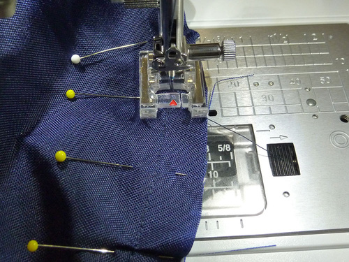 - Still using a Zipper foot and re-set for a lengthened stitch. If need be, re-thread the top and bobbin with the topstitching thread color. As mentioned above, we didn’t need to re-thread; we used navy for all our stitching.