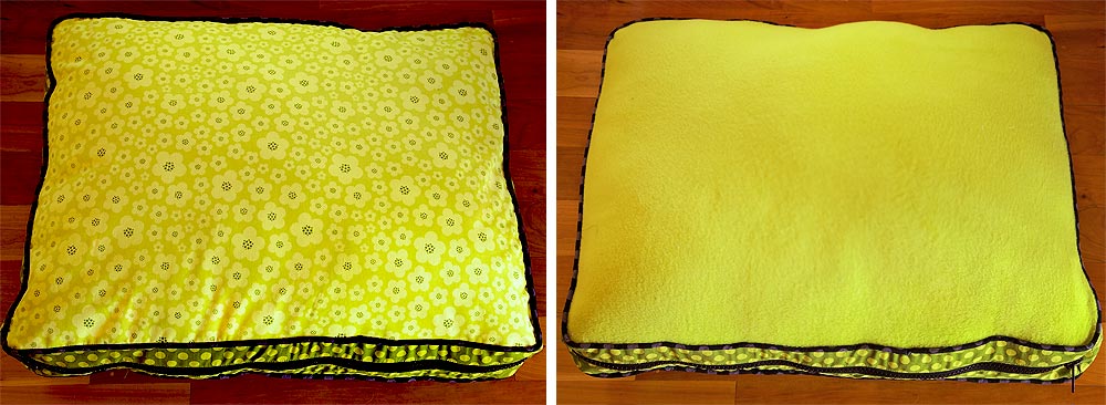 NOTE: You can simply fill up the bed with the loose polyester filling, or you can use a pillow form, or you can do what we did: stuff the filling into a large plastic bag, then insert it – bag and all – into the cover. Animals like crunchy sounds, so the crinkling of the plastic as they move around is fun for them. As a side benefit, this makes the stuffing easier to handle when you remove the cover to launder.
