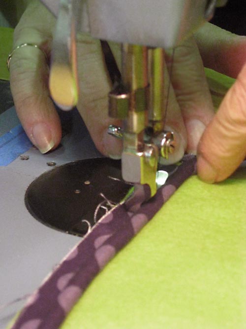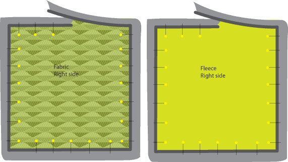 NOTE: Remember, fleece is part of the knit family and it will stretch as you sew. Go slowly and carefully. - Using a Zipper foot, baste around all four sides to attach the piping to each piece.