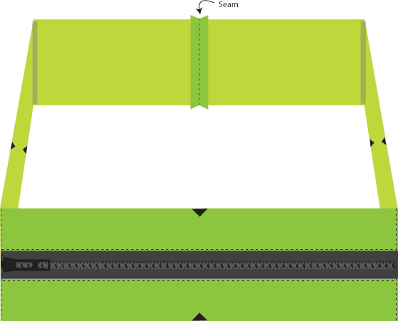 - Using a ½” seam allowance, stitch the zipper side section, right sides together, to the 61″ side strip end to end to create an 84″ ring.