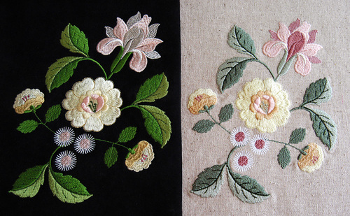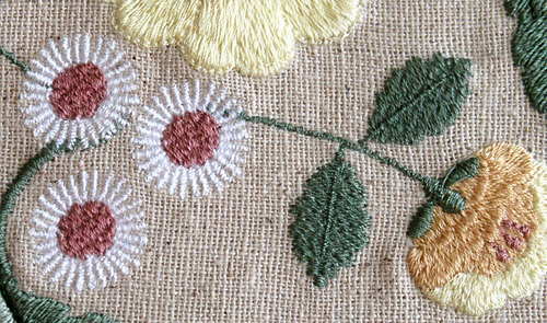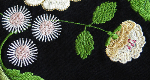 The rayon on the black fabric allows a hint of the foundation fabric to show in the centers of the white flowers. Also, there is a bit more detail in the outline of the top yellow petals and the stamen.