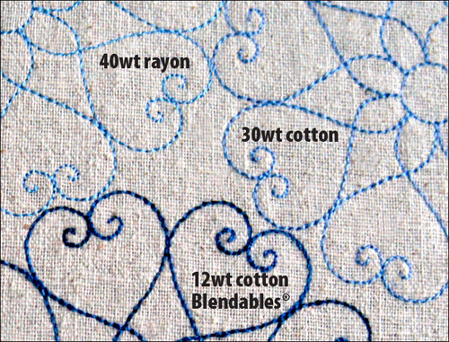 The image below compares rayon, 30-wt cotton and 12-wt cotton. You can see how thread weight plays a part in how pronounced the stitches are, and you can spot how the different sheen of each is evident. In general, 12 wt. thread should be used mostly for outline embroidery designs and requires a 16/100 needle.