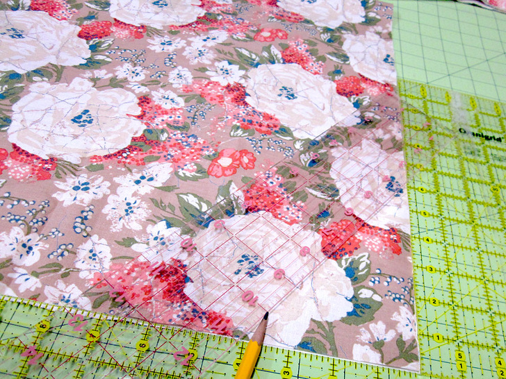 - Using three rulers, measure and mark the pocket slash. Lay one ruler across the top and one down the side. The two rulers should come together at a 90˚ angle at the fabric’s corner. You are working along the raw edges, not the folded edge.