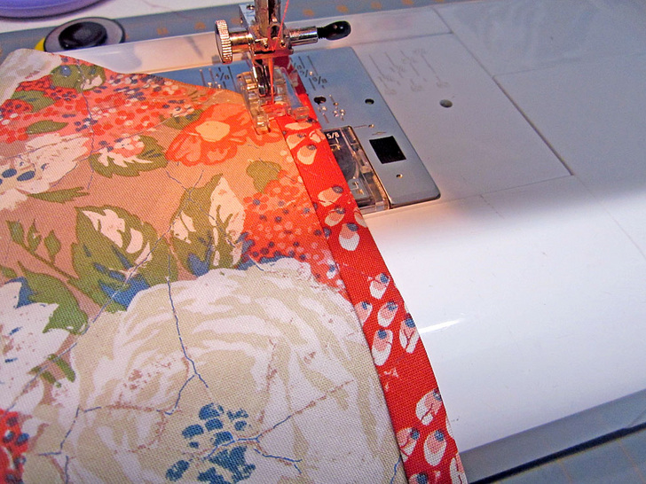 - Topstitch the binding in place through all the layers. Stay as close the outer fold as possible, but make sure you catch both the front and back of the binding.