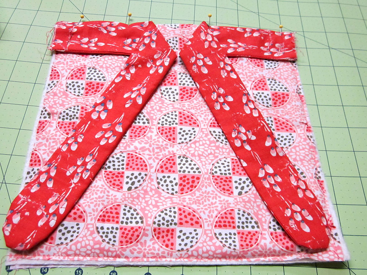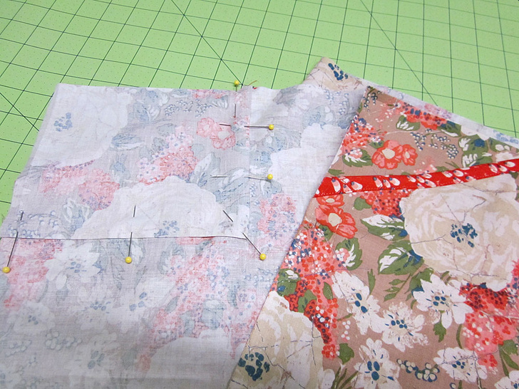 - Flip over the skirt panel. Place an appropriate square over each bound pocket slash corner, aligning the upper and outer raw edges. Pin in place along the folded side and bottom. You are filling the corner back in.