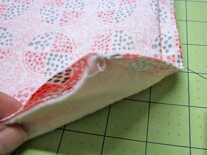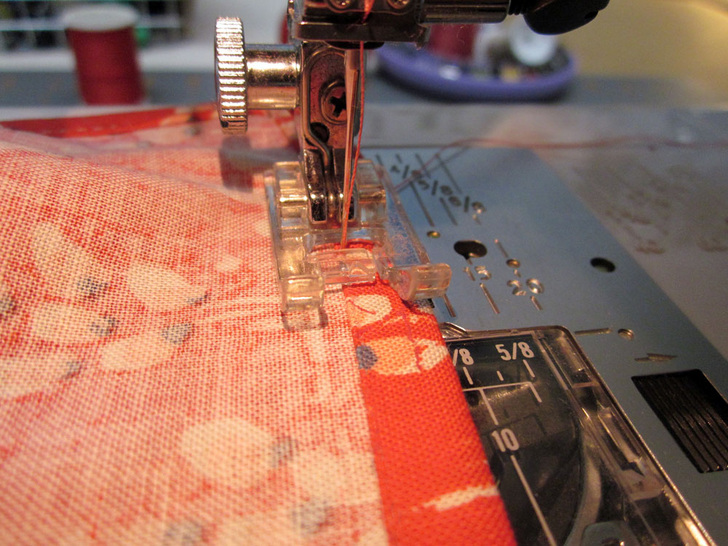 - Using a ½” seam allowance, stitch along the top edge only. Trim away the batting from the seam allowance.