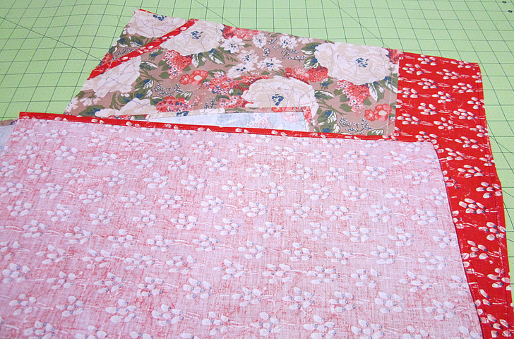 - Place the batting square on top of the two fabric pieces. Pin in place across the top edge only.