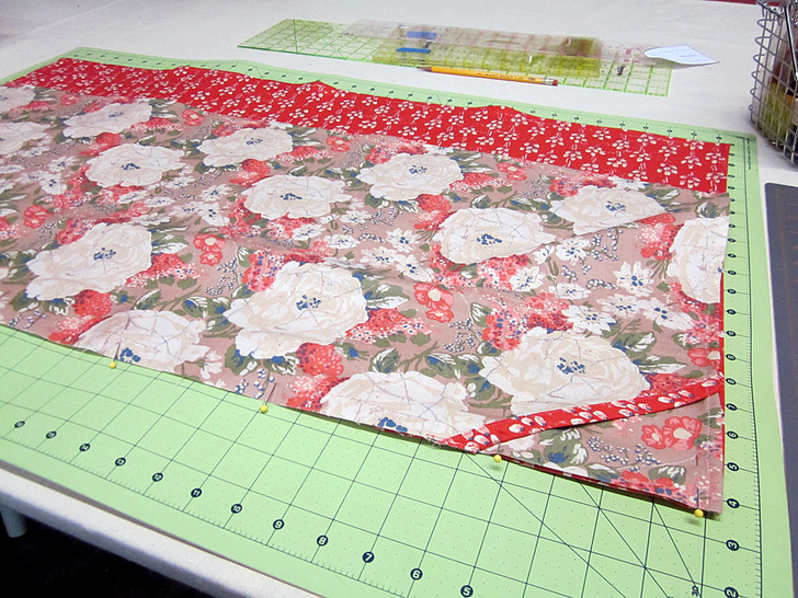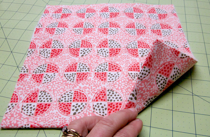 - Fold the panel in half, wrong sides together so it is now 18″ x 16″. Place the folded panel right side up on your work surface. If you have a directional motif, make sure the panel is positioned so the upper corner is indeed, the upper corner.