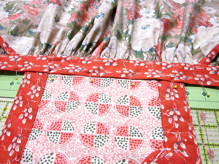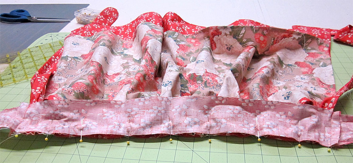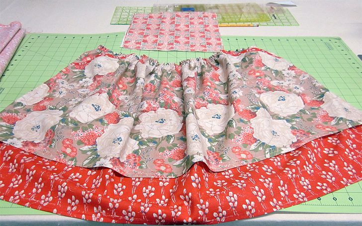 NOTE: If you are new to gathering, take a look at our tutorial: Gathering & Ruffles Made Easy. - Pull the row(s) of machine basting to gather the skirt to approximately 20″. Adjust the gathers so they fall evenly.