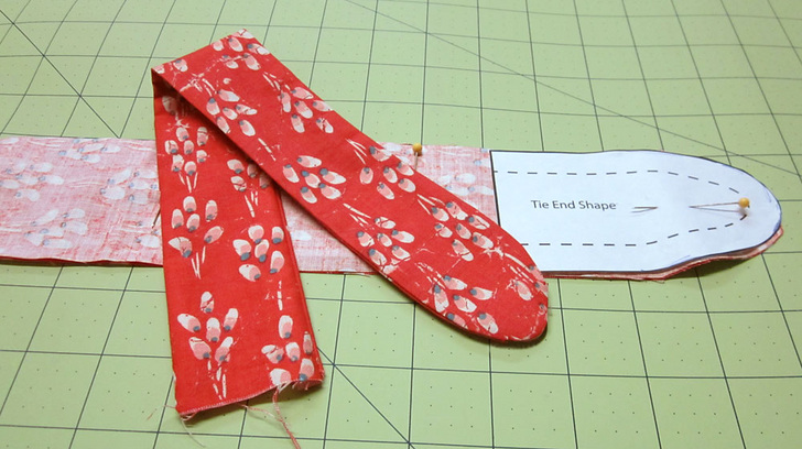 - Find the FOUR 2½” x 36″ tie pieces. Layer all four strips together into one neat stack; all edges should be flush. Place the template on ONE end. Trace around the curved end with a fabric pen or pencil. Cut along the drawn line through all four layers.