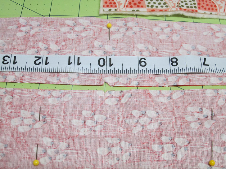 - Separate the strips into two pairs. Place each pair right sides together, aligning all raw edges. Pin together along both sides and around the curve, leaving the opposite end (the straight end) open for turning. Measure 10″ in from the straight end of each pair and mark with a pin along one side. This will be the stopping point for your seam.