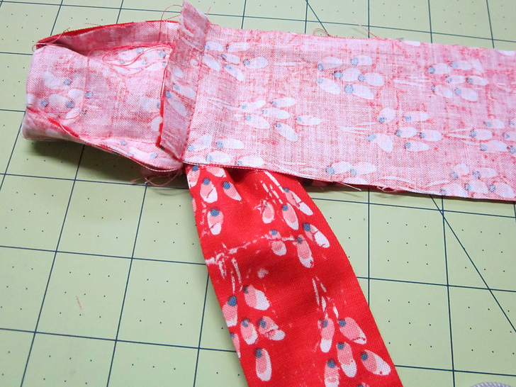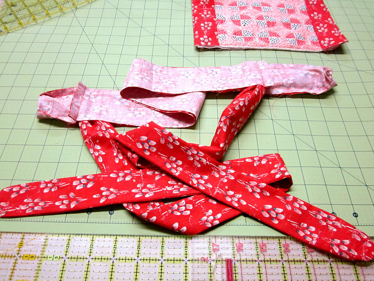 - Clip the curves, turn the ties right side out and press flat, pressing in the raw edges of the open ends (the 10″ left open) so they are flush with the sewn seam.