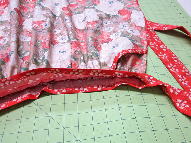 - Topstitch around the entire waistband, making a large rectangle of stitching. Start just to the outside of one waistband/tie seam – in line with the side hems of the skirt. Stitch vertically up across the tie, pivot, stitch horizontally across the top of entire waistband (this closes the opening left for inserting the bib), pivot just to the outside of the waistband/tie seam, stitch vertically down across the tie, pivot, stitch horizontally across the bottom of the entire waistband, ending up right where you started. The ends of the ties themselves are not topstitched.