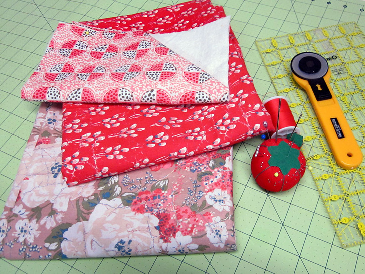 - Find the two 10″ x 10″ fabric squares and the 10″ x 10″ batting square.