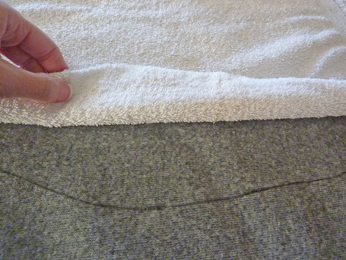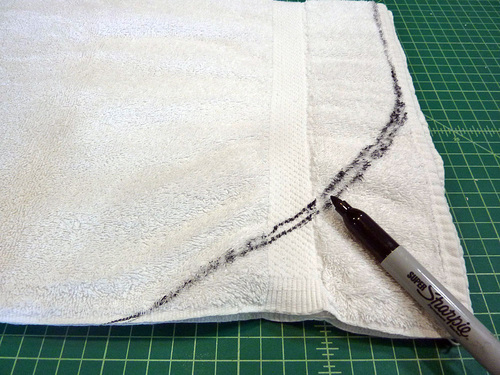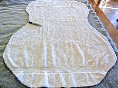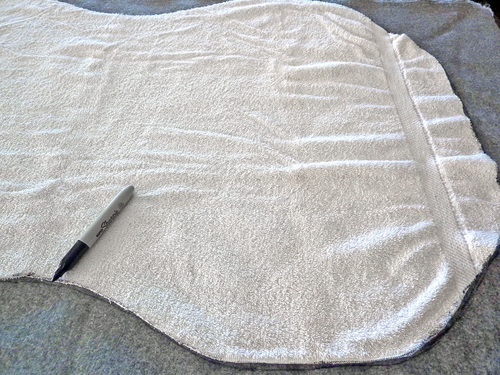 - Fold the towel in half widthwise and lay it over the back of the chair. Use a marker to sketch in a basic curving point at the top and also sketch in about how much to come in at the fold to clear the arms of the chair and create the smaller center of the pelt shape.