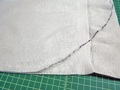 - When the top and bottom are trimmed, re-fold vertically and extend your original center markings to create a gentle curve at the towel’s center. Again, trim one layer at a time.