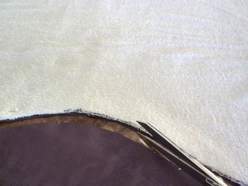 - Cut along the drawn line. When cutting, the idea is to cut only the backing and not the fur nap. Use just the tips of your scissors. With the wrong side facing up, slide the bottom blade of your scissors up next to the backing. Cut with short, deliberate snips, being careful to cut just the backing. If you feel a drag, you’re starting to cut the nap. Back off and start again.