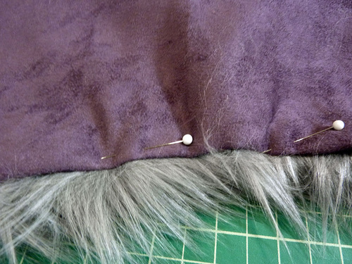 - Pin or clip in place along the raw edges at a right angle, this will allow you to sew right up to the pin before pulling it out. Also, when pinning faux fur, remember to tuck the fur to the inside as you go so you are less likely to catch up the hairs in the seam (check out that Sewing with Faux Fur tutorial for more details and photos).