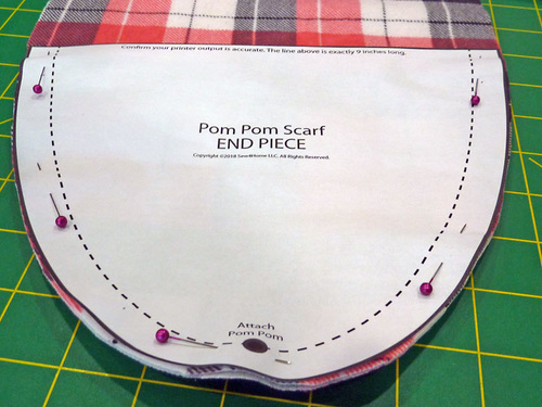 NOTE: Be careful to match each WOF strip. This means, depending on the size of the plaid repeat, your strips are unlikely to be cut one right under the other with their edges butted together. Instead, the two pieces should be spread out on the fabric to make sure the plaid pattern within each 9″ height is exactly the same. - Place the two rectangles wrong sides together. Pin the Scarf End pattern at one end, pinning through both layers. The pattern should span the full width of the fabric. The curved end should sit just above the raw edges so you can cut a full smooth curve.