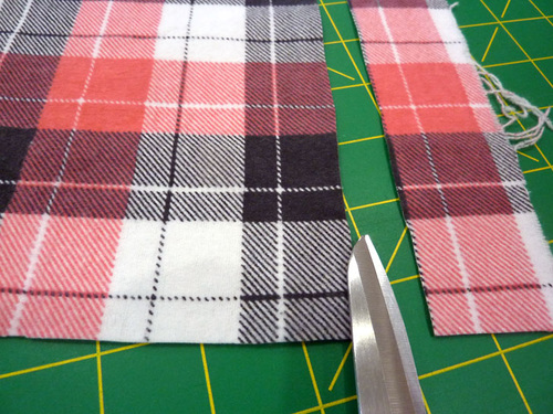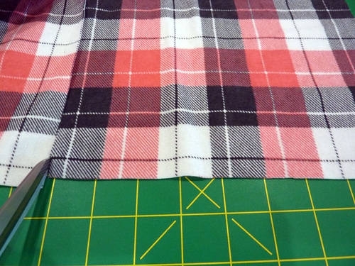 - Slightly trim the straight 9″ edge of each plaid flannel rectangle to get a nice match for what will become the scarf’s back seam.