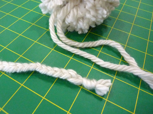 - Thread one of the pom’s ties through the hole in the braid.