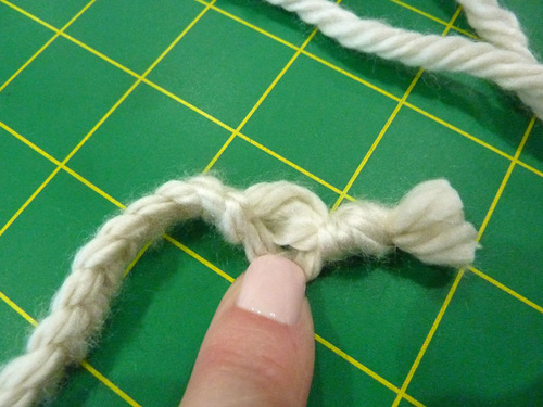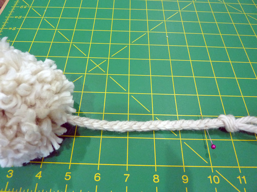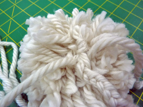 - Cinch tight, pulling on both of the pom’s ties, and knot securely so the end of the braid disappears into the fluff of the pom