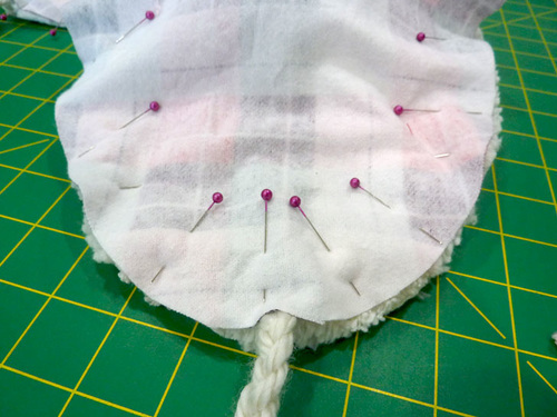 - Repeat to pin the opposite pom in place.