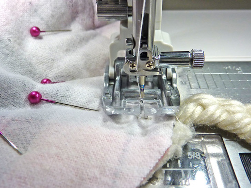 - Re-thread the machine if necessary with thread to best match the flannel in the top and to best match the sherpa in the bobbin.