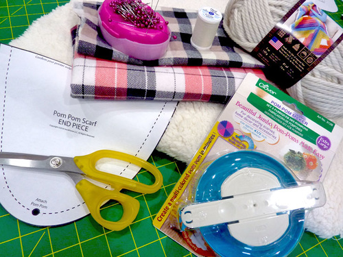 The biggie poms at either end of the scarf are a quick and easy embellishment, especially if you take our recommendation to work with a super chunky yarn. We used an extra large Clover Pom Maker but you could also make them by hand with a cardboard template. Descriptions for both techniques are given below.