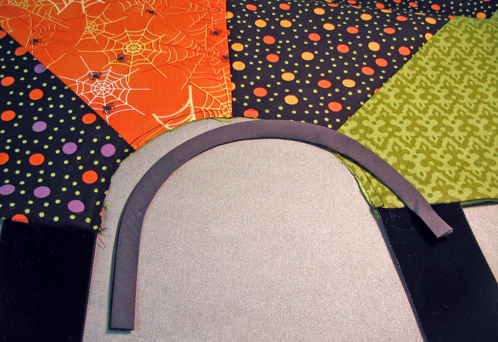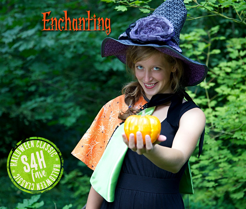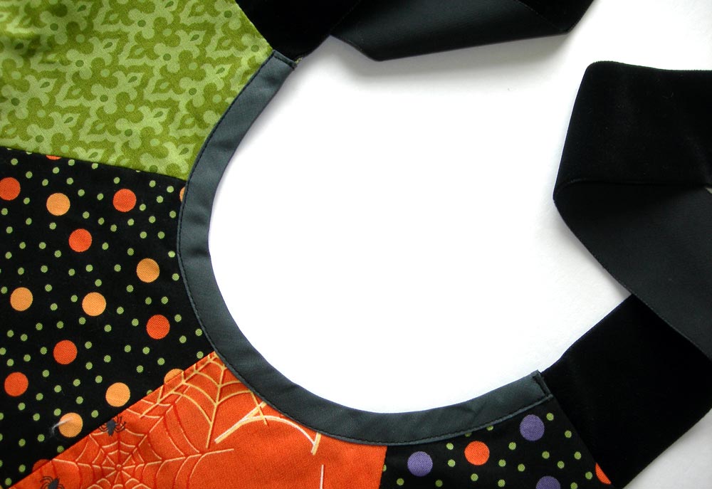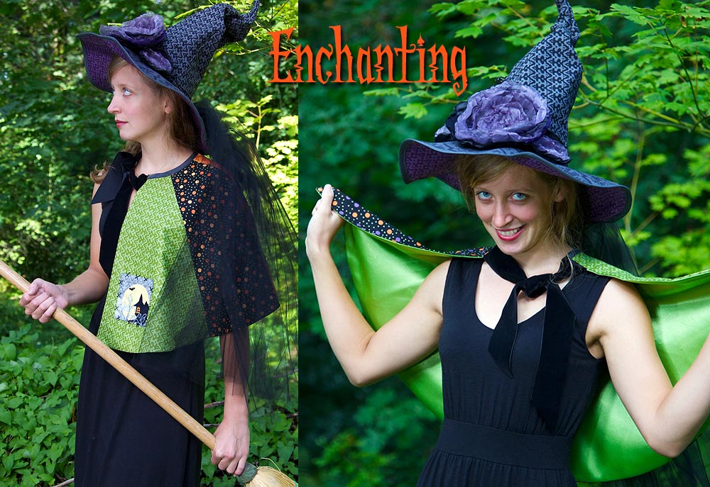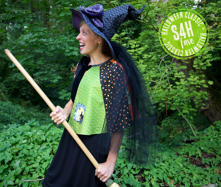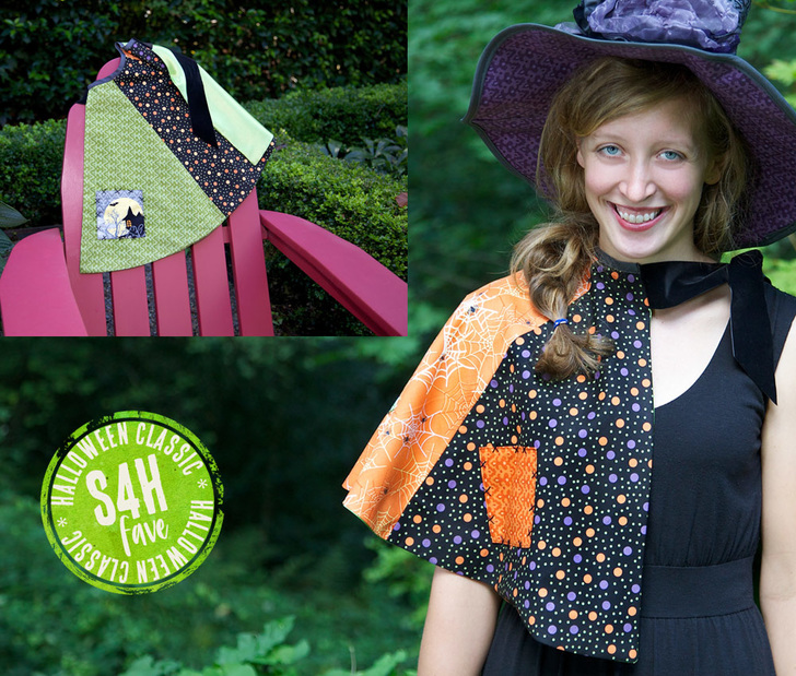 No self-respecting Halloween witch would be caught out under the moon without three important items: a flying broom, a pointy hat, and a kookie cape. Turns out flying brooms are rather hard to come by, but we have you covered on the other fronts. Check one: the cape. Ours is a stylishly short Capelet made of witchy wedges cut from fat quarters, lined with Green Slime satin, and tied ’round the neck with Spider Black velvet ribbons. The matching hat is linked below. A ghoulish yet glamorous get-up.