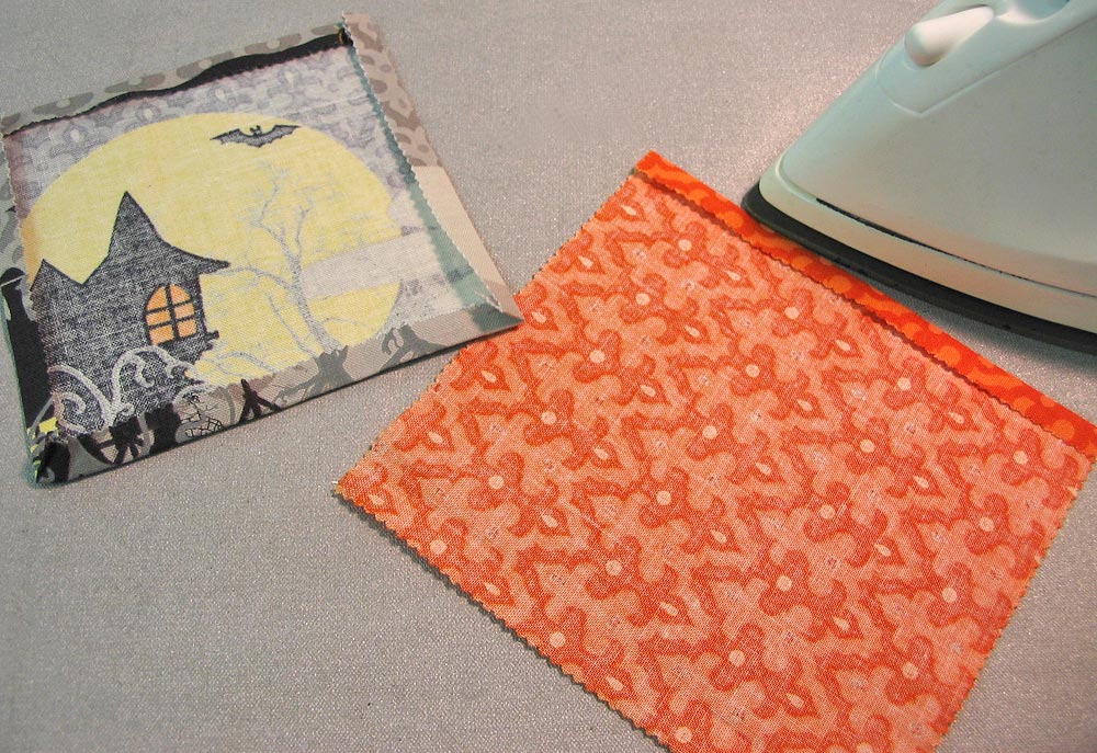 - Press back all raw edges on all four sides of the THREE Charm Squares (or three 5″ x 5″ pieces of fabric) ¼”. Set aside.
