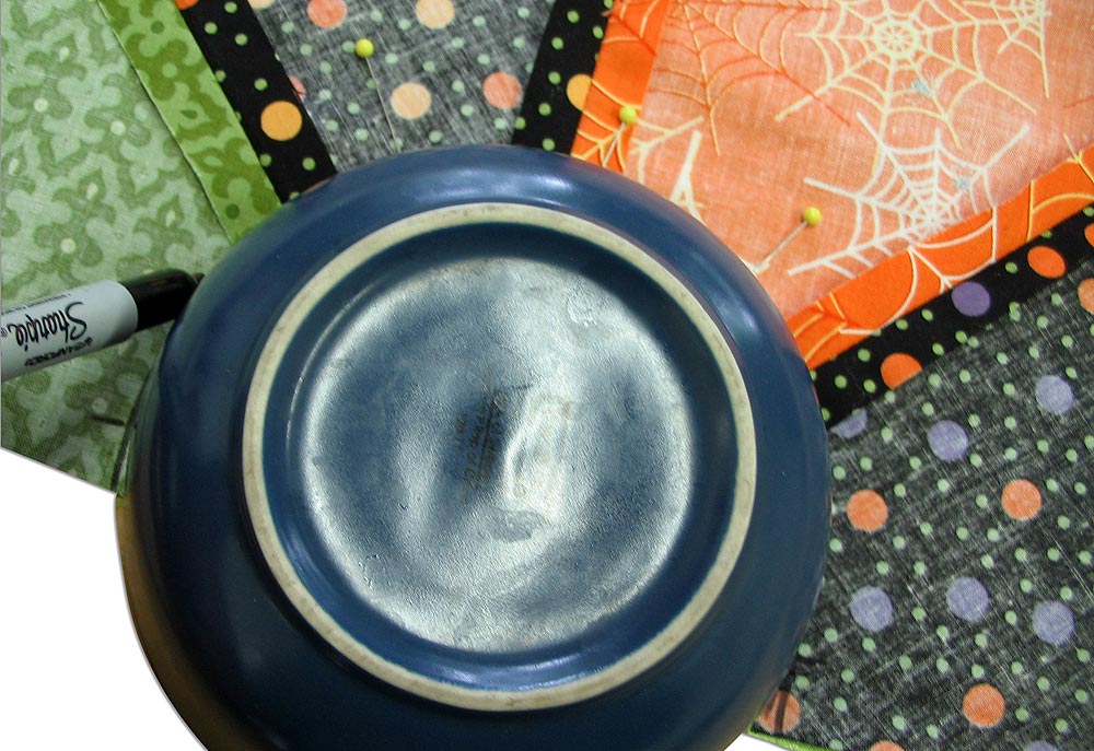 - Find a dish or bowl that measures about 6″ is diameter and place it at the center of the wedges. This will create the neck ring of the cape. Draw around the dish at the back curve, but come straight down at the sides.