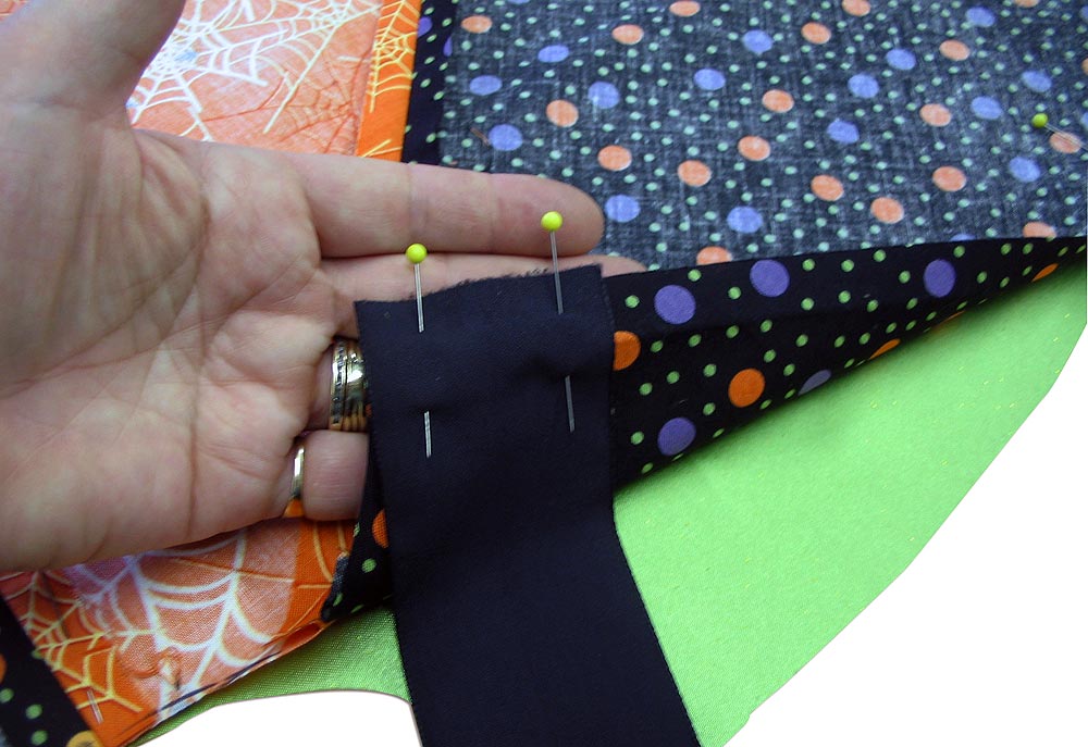 - Tuck the ties in between the two layers. Make sure they are out of the way of all seams. You can lightly pin them to the middle of the cape if you feel safer.