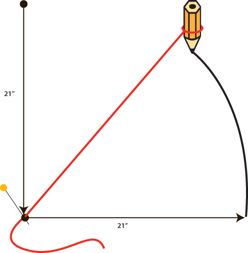 - Cut a piece of string about 23-25″ long. Pin one end of the string to the 90° corner of your two drawn lines. Tie the other end to a pencil. Make sure, after you’ve tied the string to the pencil, the string measures now measures 21″ from corner to pencil point. This is very important! In essence, you’ve just made your own little compass.