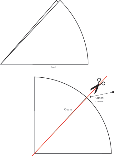 - Fold your quarter circle in half and crease the folded edge. Open it back up and cut along the crease. Ta-da #2… perfect triangle wedge.
