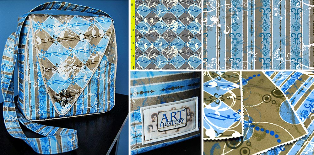 TH: As I said earlier, I’d been dreaming up and sketching out my fabric ideas for a long time before discovering Spoonflower. My desire to create fabric came from a dream to see my own artwork on yards of material. I was already in the habit of drawing patterns for items I couldn’t find at all or couldn’t find in the style that was me. As I stitched up these patterns, I thought about how cool it would be to have a complete ‘Tammy Original’ –my own pattern and my own fabric from which I’d create personalized gifts for family and friends. Before Spoonflower, I did some experimenting with very small scale projects, including those fabric sheets you run through your home printer. I even created a little barrel purse for my sister with a design of her dog, Jessie, done up Andy Warhol style.